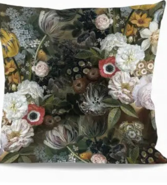 En velours polyester, imprimée recto verso, passepoil noir, fermeture zippée.