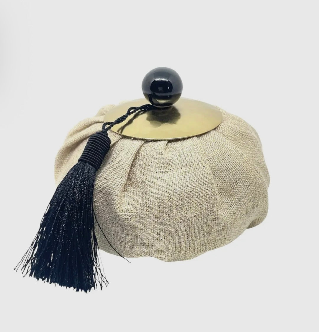 Aumônière parfumée senteur Figue Edan dans un tissu coton lin bei geet d'un ornement en métal doré et rehaussé d'une perle noiree avec un cordon frangé noir.