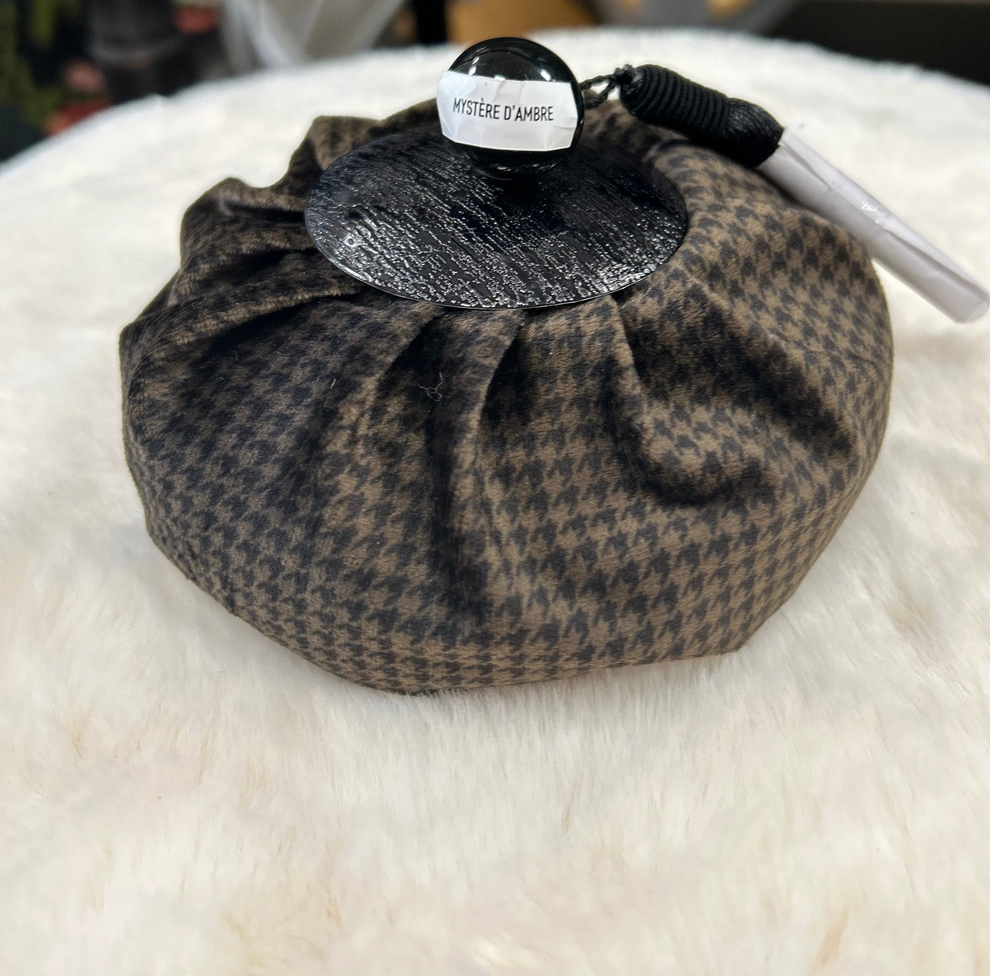Aumônière parfumée senteur Mystère d'Ambre dans un tissu velours effet pied de poule et d'un ornement en métal travaillé noir strié et rehaussé d'une perle noire avec un cordon frangé.