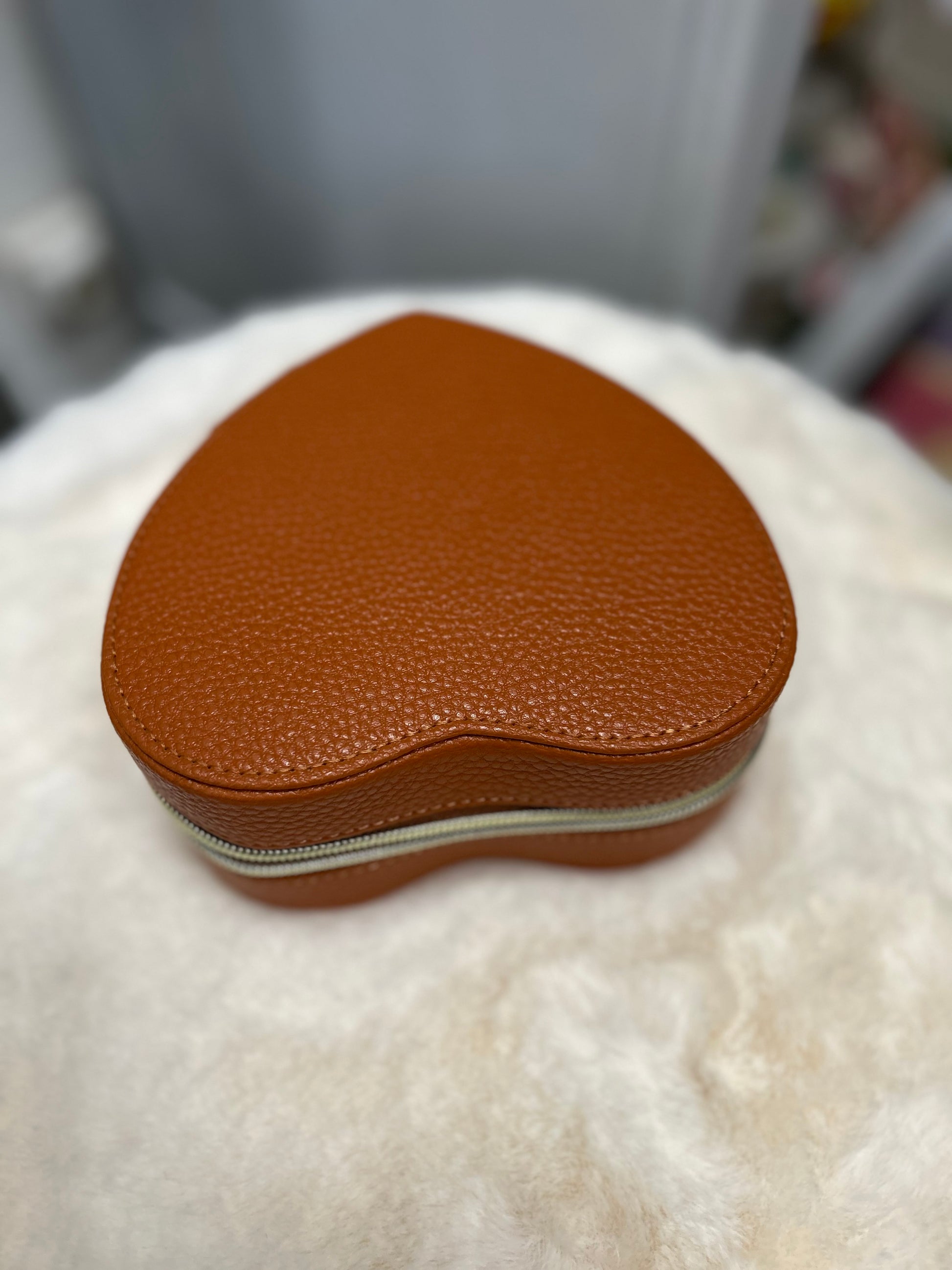 Boîte à bijoux de voyage en forme de coeur comprenant deux compartiments de rangement plus un présentoir à boucle d'oreilles Fermeture à glissière dorée sur le pourtour.