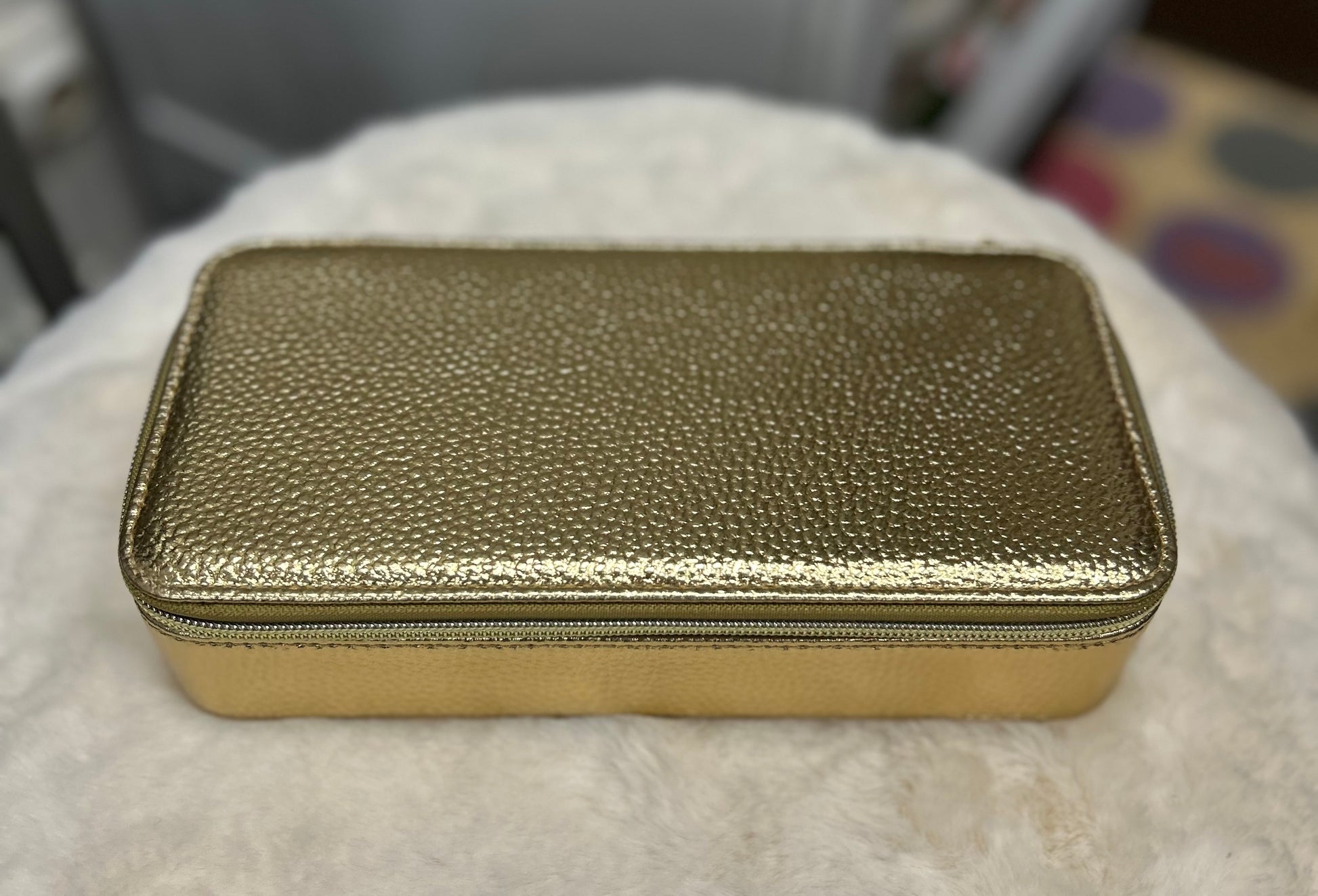 Boîte à bijoux de voyage rectangulaire avec fermeture à glissière dorée sur le pourtour.