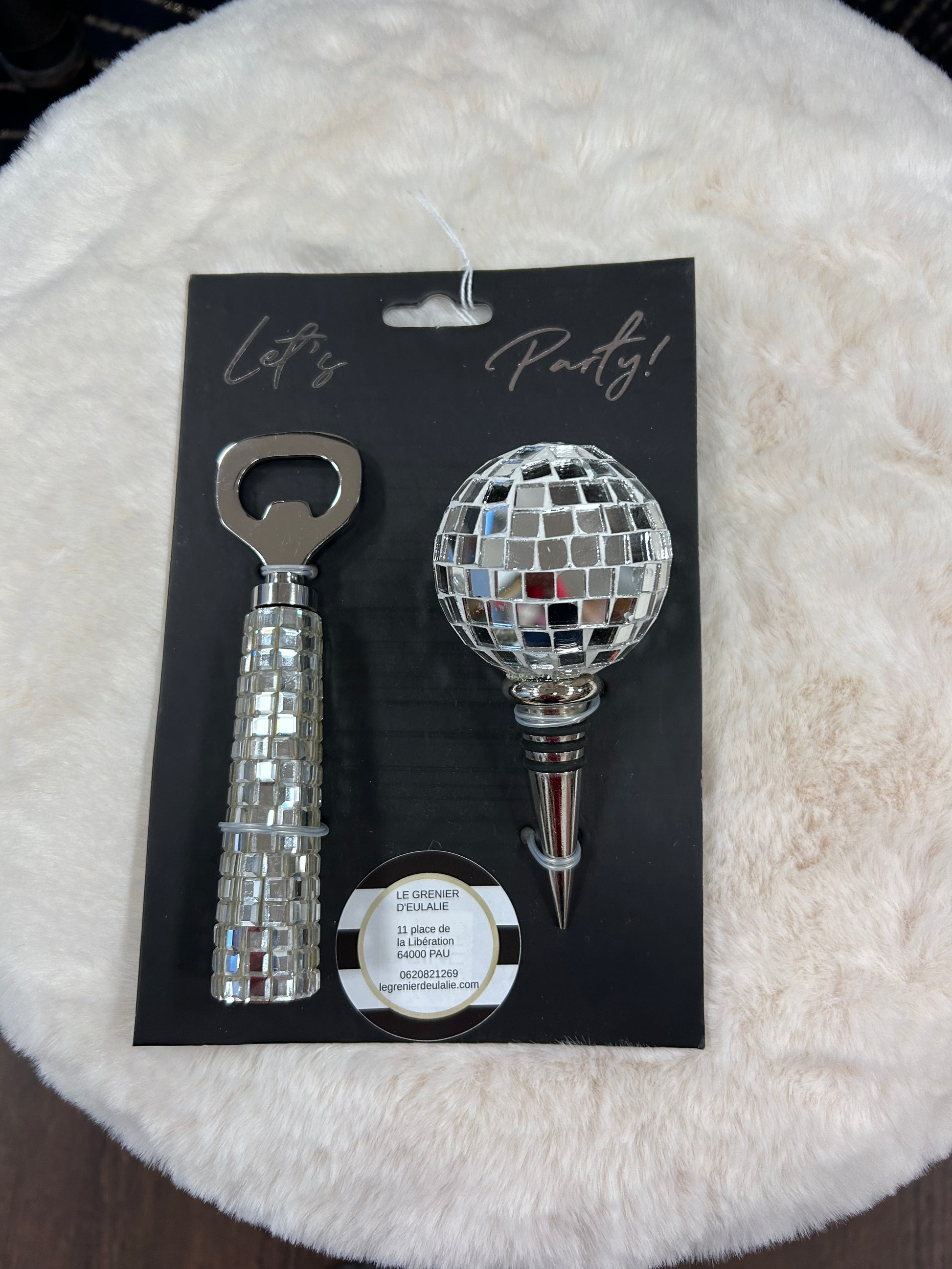 Surprenez vos invités avec ce duo de décapsuleur et bouchon de bouteille à facettes argentées.