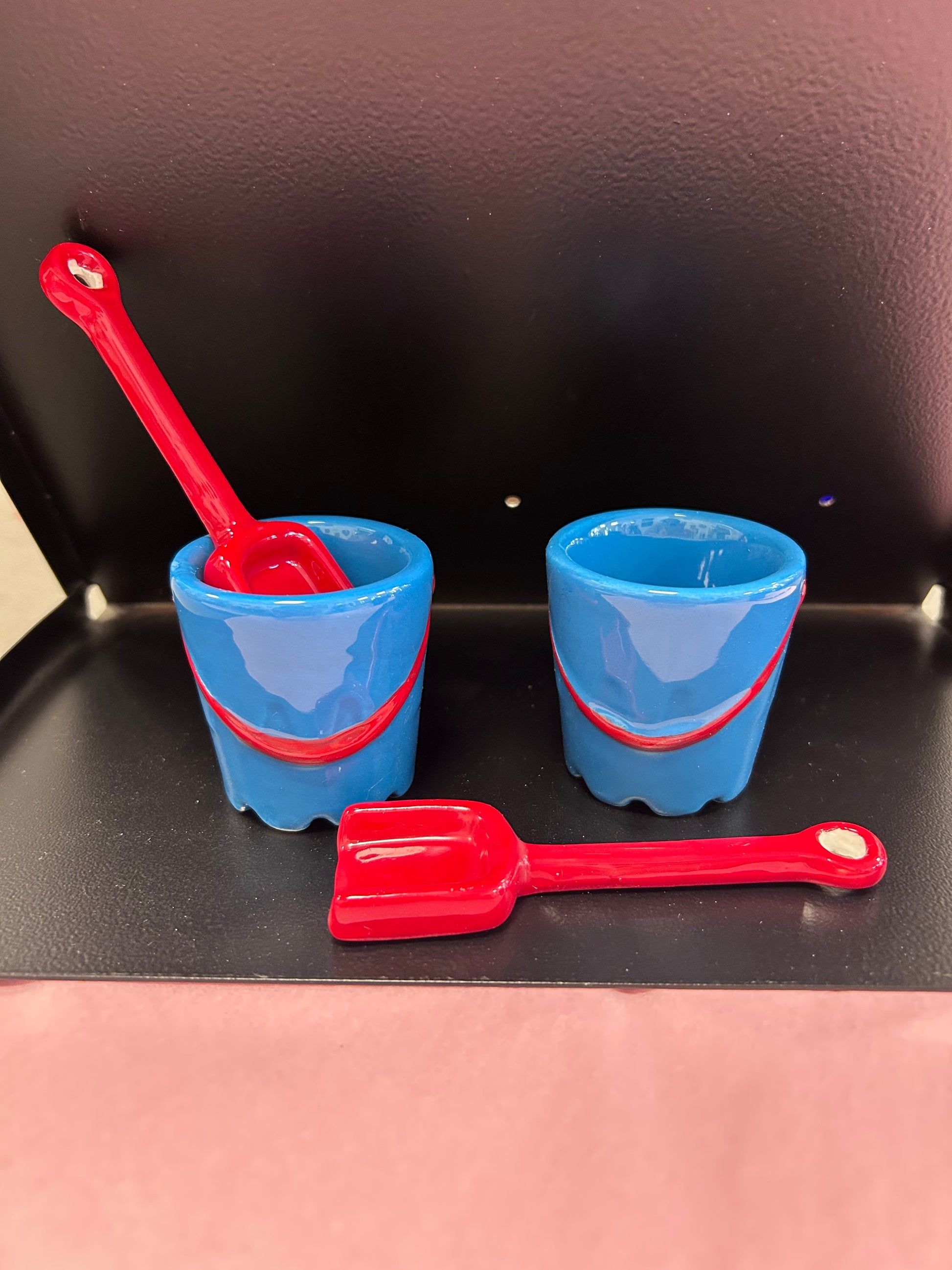 Duo de coquetiers en forme de seau de plage avec sa pelle.