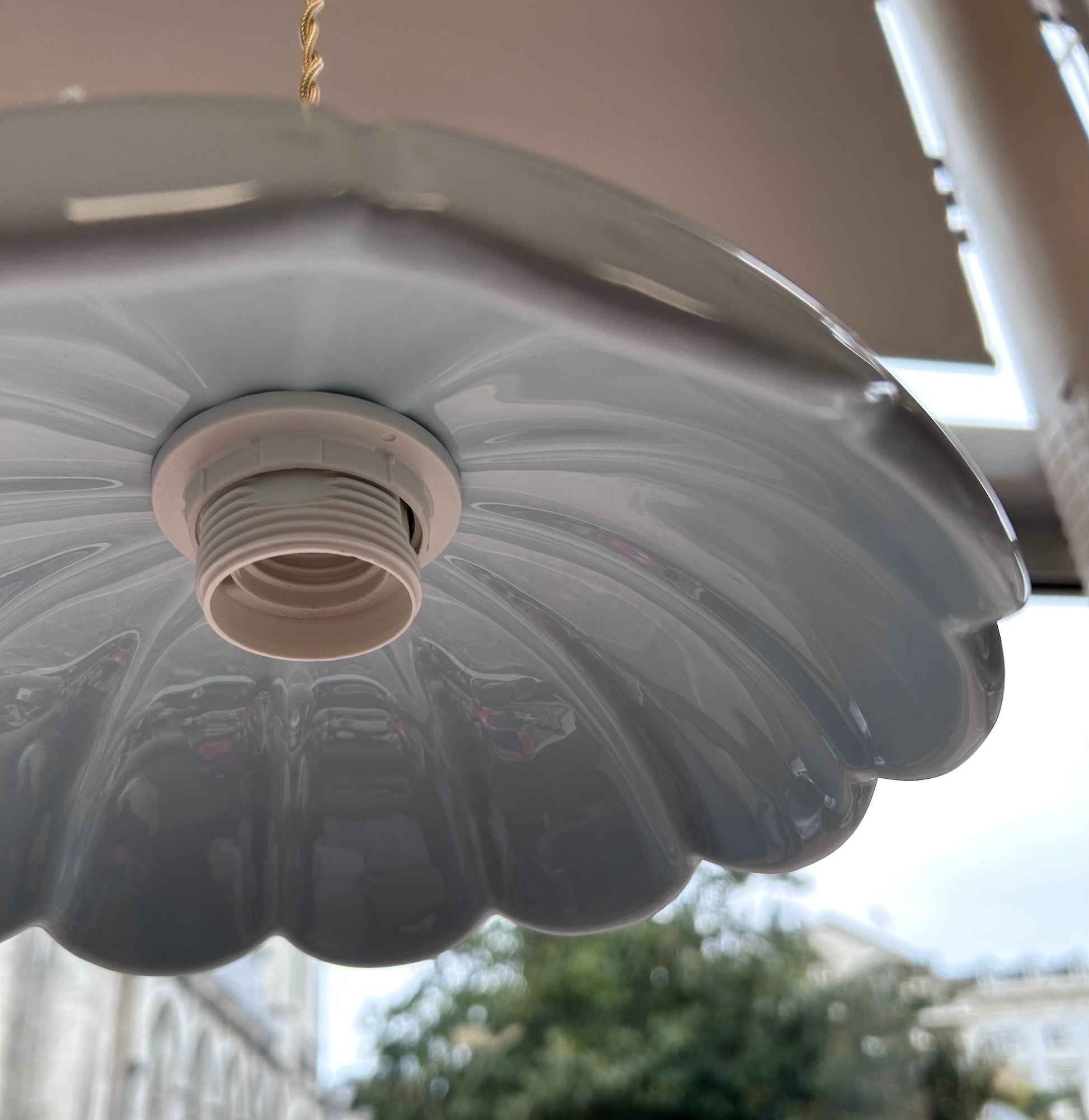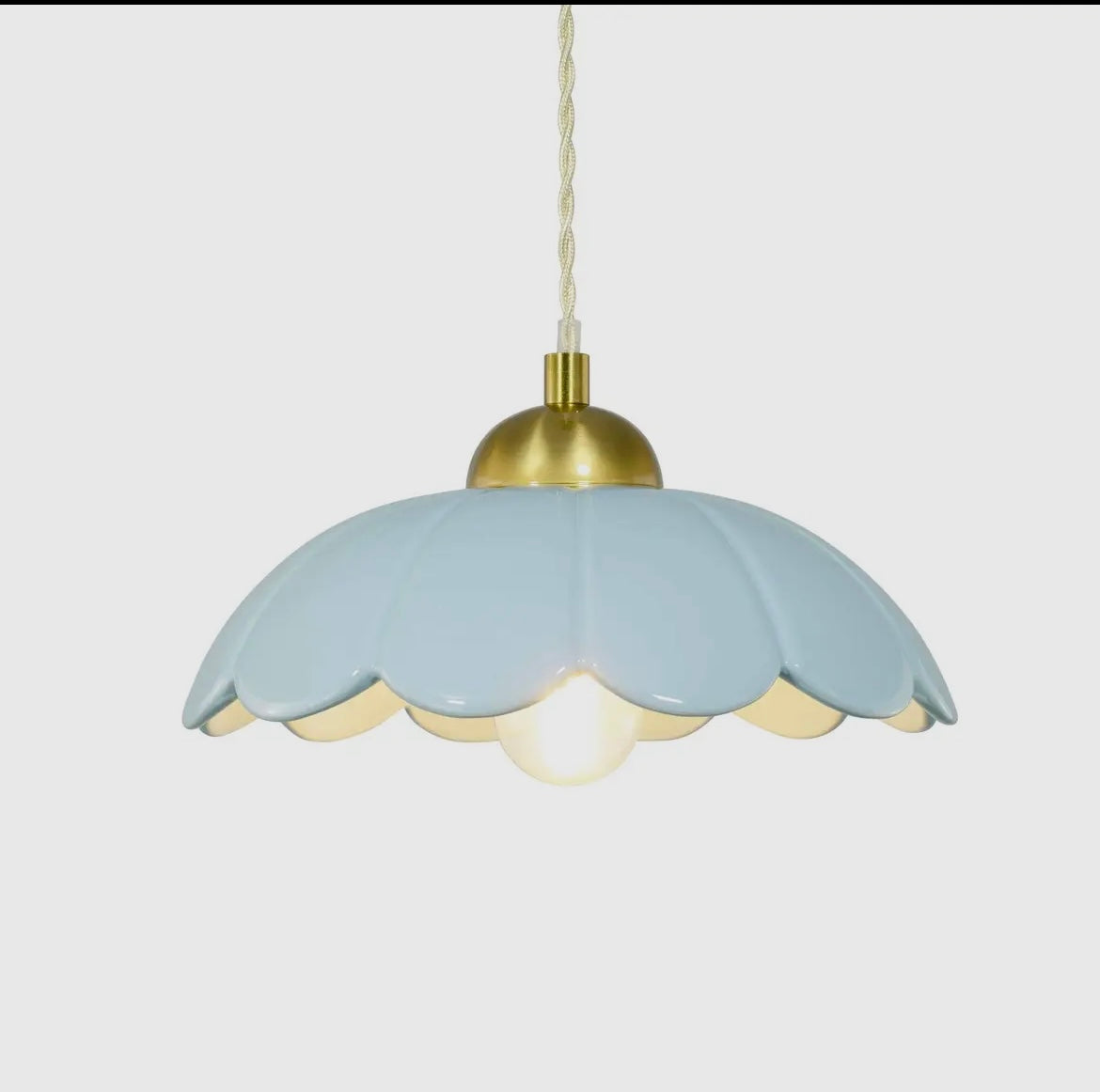 Suspension en céramique bleue avec cache douille en métal doré accentuée par un cordon beige torsadé.