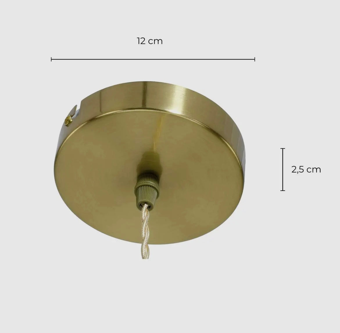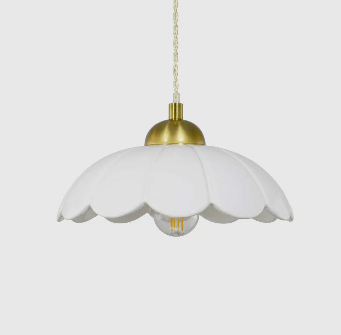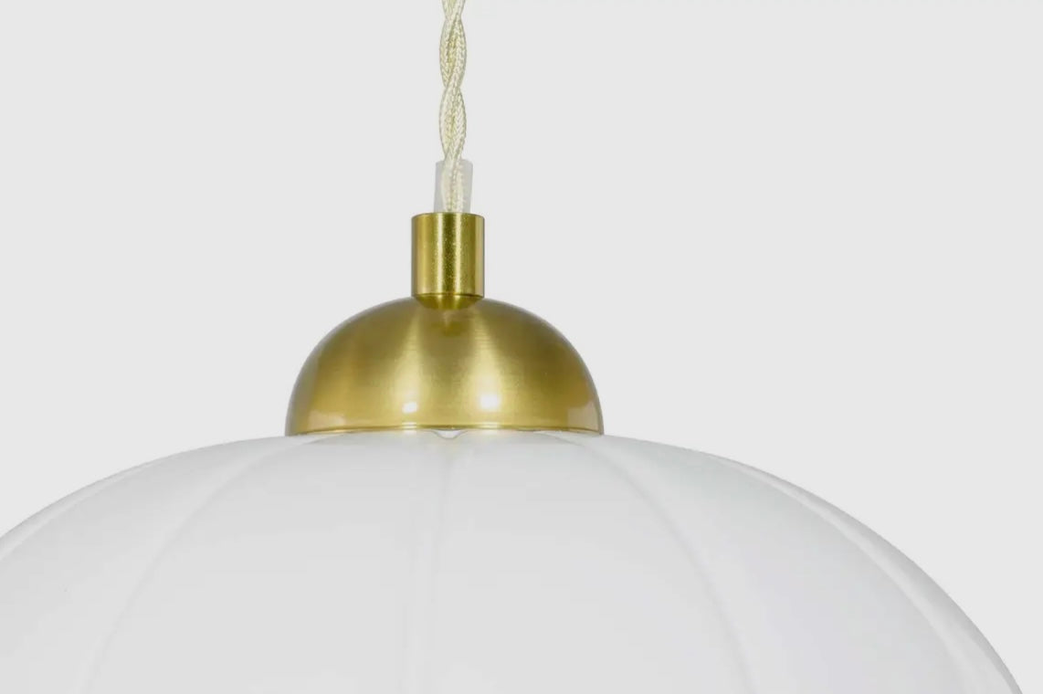 Suspension en céramique blanche avec cache douille en métal doré accentuée par un cordon beige torsadé.