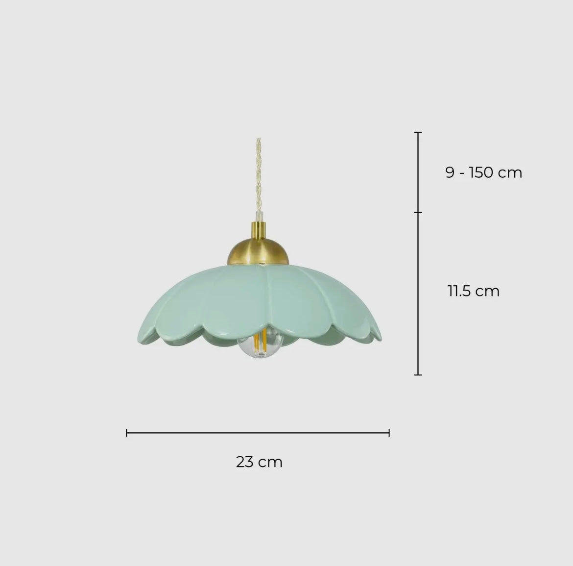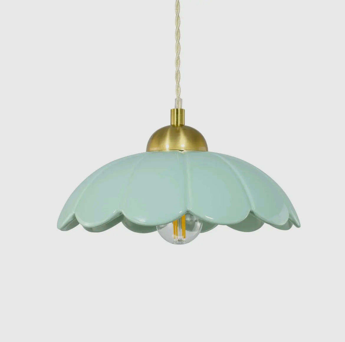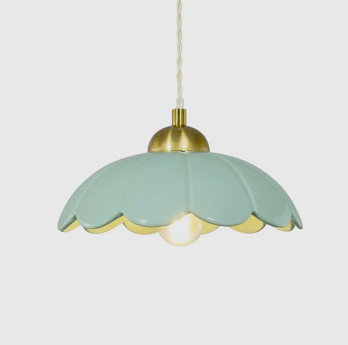 Suspension en céramique vert d'eau avec cache douille en métal doré accentuée par un cordon beige torsadé.